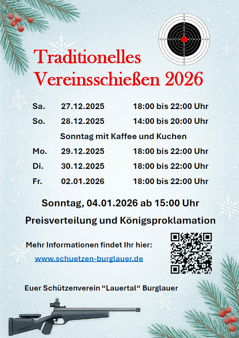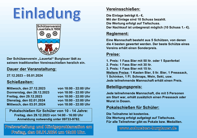 17.01.2025 - Zur Generalversammlung des Schützenvereins „Lauertal“ Burglauer ergeht hiermit folgende Einladung: |