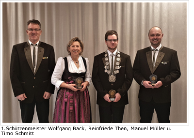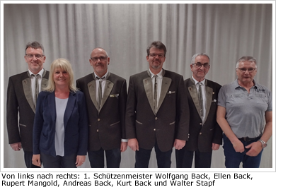 Bei den Wahlen wurden in ihren Ämtern 1. Schützenmeister Wolfgang Back, 2. Schützenmeister Mirco Friedrich, Schatzmeister Michael Kaiser, Schriftführerin Birgit Hoffelner, Sportleiter Fabian Back, Jugendleiter Thorsten Back, Kassenprüfer Lukas Then und Timo Schmitt für weitere drei Jahre bestätigt. Dem Sachausschuss gehören an: Andreas Back, Kurt Back, Michael Back, Lukas Bäumker (Neu), Helmut Brischke, Timo Schmitt, Karlpeter Then, Lukas Then und Volker Wagenbrenner.