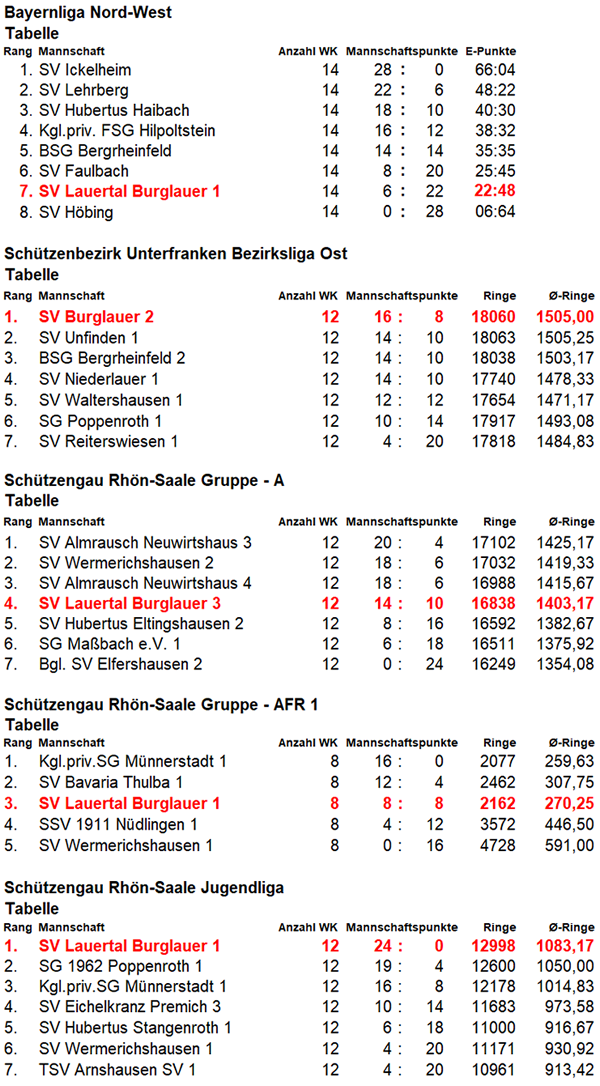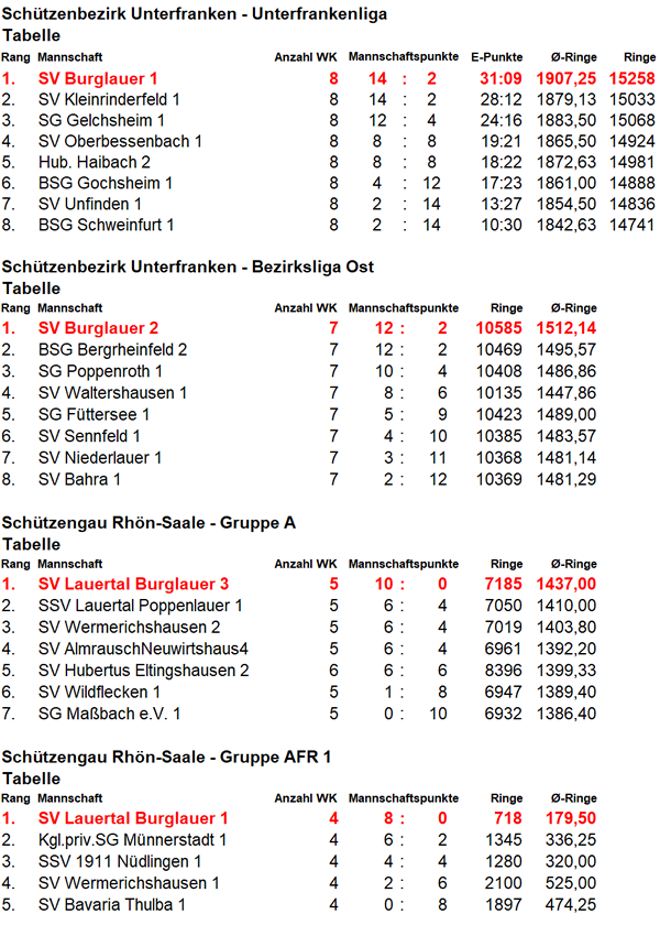 Ein Lichtblick war das Abschneiden unserer 4. Mannschaft in der Gruppe AFR 1. Mit den Schützen Thorsten Back, Michael Back, Kurt Back, Andreas Back, Helmut Brischke und Sonja Beck konnte sie ungeschlagen den Meistertitel erringen. Leider ging der Endkampf stark ersatzgeschwächt gegen Elferhausen verloren. Unsere 1. Mannschaft belegte in der Unterfrankenliga mit den Schützen Bernd Back, Fabian Back, Anja Weingärtner, Andrea Gehring und Ute Back den 4. Platz. In der Bezirksliga Ost kam die 2. Mannschaft mit Melanie Werner, Simon Breunig, Helmut Brischke und Heidi Krug auf einen soliden 3. Platz. Die 3. Mannschaft, die als Aufsteiger in die Gauliga ging, erzielte ebenfalls einen guten 3. Platz mit Lukas Bäumker, Moritz Katzenberger, Mirco Friedrich, Manuel Müller, Michael Kaiser und Patrick Baumbach.