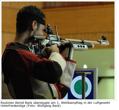 Die neuformierte Mannschaft konnte dann auch am 1. Wettkampftag in Haibach überzeugen. Gegen den Gastgeber entwickelte sich von Anfang an ein einseitiger Wettkampf. In allen Paarungen konnten sich unsere Schützen teilweise deutlich durchsetzen. Die neue Nummer eins Bernd Back sorgte mit 388 Ringen für das beste Wettkampfergebnis.