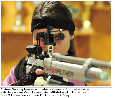 In der Spitzenbegegnung auf Position eins kämpfte sich Jana Schlesinger nach missglückten zwei Auftaktserien mit zwei 98er Serien wieder heran, verlor aber letztendlich mit 385:388 Ringen. Dagegen lagen auf den weiteren Positionen von Anfang an alle Burgläurer Schützen in Führung, die keiner mehr aus der Hand gab.