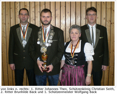Christian Seith kam mit dem neuen Modus am besten zurecht und sicherte sich mit einem 128 Teiler den Titel. Das Königshaus wird komplettiert durch den 1. Ritter Johannes Then (272 Teiler) und den 2. Ritter Brunhilde Back (739 Teiler).