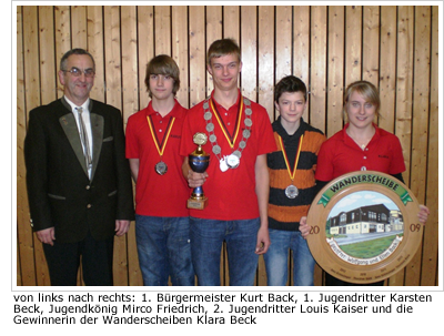 Bei den Jungschützen gewann Mirco Friedrich den Titel des Jugendkönigs mit einem 412 Teiler. 1. Ritter wurde Karsten Beck mit einem 483 Teiler vor Louis Kaiser, der mit einem 586 Teiler 2. Ritter wurde.