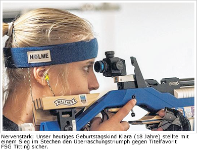 Als das Startkommando für den Stechschuss fiel, war es im Schützenhaus so ruhig, dass man eine Stecknadel hätte fallen hören. Paal schoss schnell eine Neun, die gelb angezeigt wird und kurz darauf zeigte der Monitor bei Klara eine rote Zehn an. Großer Jubel war zu hören, denn jetzt war der Überraschungssieg sicher.