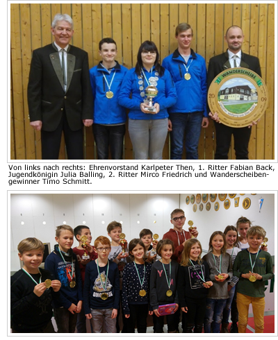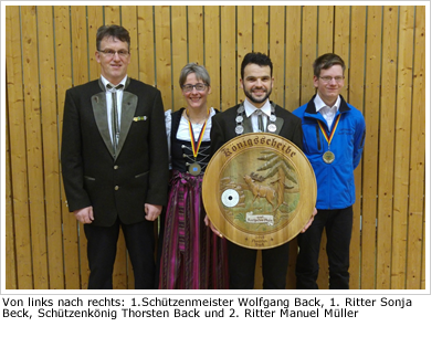 Der Schützenkönig wurde wieder mit dem Modus der vergangenen Jahre ermittelt. An den Schießständen wurden die Luftgewehre platziert. Jeder Teilnehmer loste seine Stand- und Durchgangsnummer. Bei jedem Durchgang wurden fünf Schuss abgegeben. Der schlechteste Schütze schied aus. Nach jedem Durchgang wurde neu gelost. Nach knapp drei Stunden Schießzeit blieben vier Teilnehmer übrig, die dann im Finale den neuen Schützenkönig mit den Rittern ermittelten. Für alle Teilnehmer waren keine Hilfsmittel (Schießjacke, Handschuh usw.) erlaubt. Thorsten Back kam mit dem Modus wieder am besten zurecht und konnte mit einem 168-Teiler seinen Titel vom Vorjahr verteidigen. Als 1. Ritter stehen ihm Jugendleiterin Sonja Beck (261-Teiler) und als 2. Ritter Manuel Müller (362-Teiler) zur Seite. Anders als in der Schützenklasse durften die Jungschützen mit ihrem Gewehr und Schießkleidung 10 Schuss auf den Jugendkönig abgeben. Den Titel sicherte sich Julia Balling mit einem 64-Teiler. 1. Ritter wurde Fabian Back mit einem 94-Teiler vor Mirco Friedrich, der mit einem 191-Teiler 2. Ritter wurde.