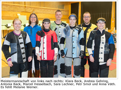 Bei den Deutschen Meisterschaften vertrat Anna-Lena Albert, Bernd und Ute Back unseren Verein. Anna-Lena erzielte mit der Armbrust 10m 375 Ringe (11. Platz), Ute 359 Ringe (50. Platz) und Bernd 382 Ringe (28. Platz). Das bedeutete ein Mannschaftsergebnis von 1116 Ringen (24. Platz). In der Disziplin KK - 3x20 belegte Bernd mit 570 Ringen den 35. Platz.