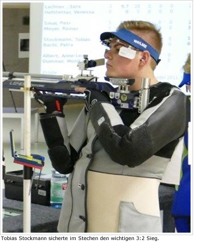 Nichts für schwache Nerven war die Begegnung gegen die Oberbayern. Sah unser Team nach Dreiviertel des Wettkampfes schon wie der sichere Sieger aus, wurde es am Ende doch noch ganz eng. In der Spitzenpaarung spulte Antonia Back in gewohnter Manier ihren Wettkampf ab und gewann überlegen mit 394:385 Ringen gegen die Österreicherin Nadine Ungerank. Auf Position zwei verspielte Petr Smol seinen Vorsprung in der letzten Serie und unterlag Johanna Irlinger mit 390:392. Sara Lechner geriet nach anfänglichen Schwierigkeiten ins Hintertreffen. Sie steigerte sich, holte Ring für Ring auf und musste sich dann doch noch letztendlich mit 387:388 Ringen knapp geschlagen geben. Auf den beiden hinteren Paarungen konnte sich Anna-Lena Albert auf Position vier in der dritten Serie gegen Diana Ober etwas absetzen. Sie gab diese Führung nicht mehr aus der Hand, siegte deutlich mit 388:380 Ringen und sorgte somit für das zwischenzeitliche 2:2 Unentschieden. Auch Tobias Stockmann lag nach zwei Serien mit acht Ringen in Vorsprung. Doch sein Gegner Robert Ober konterte mit zwei 99er Schlussserien und erkämpfte den nicht mehr für möglich gehaltenen Gleichstand (385:385). Somit musste das Stechen wieder einmal über Sieg oder Niederlage entscheiden.