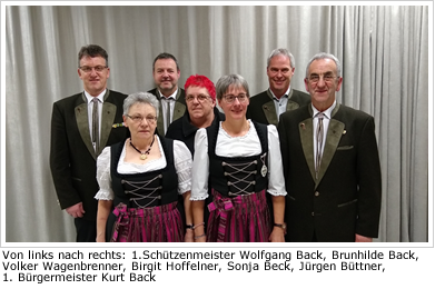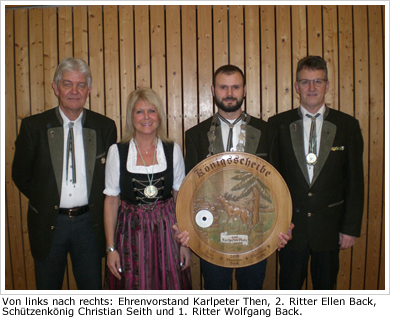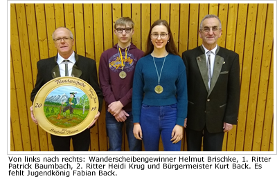 Nach 2001 und 2014 sicherte sich Christian Seith mit einem 212-Teiler zum dritten Mal den Titel des Schützenkönigs. Ihm zur Seite steht als 1. Ritter Wolfgang Back, der einen 284-Teiler schoss. 2. Ritter wurde Ellen Back mit einem 329-Teiler. Bei der Jugend verteidigte Fabian Back mit einem 65-Teiler seinen Titel erfolgreich. Seine Ritter sind Patrick Baumbach mit einem 88-Teiler und Heidi K