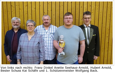 Neuer Titelträger wurde mit einem Gesamtergebnis von 141 Teilern die Gruppe Asternweg mit ihrer besten Einzelschützin Anette Seehaus-Arnold (19,7-Teiler). Knapp geschlagen geben musste sich der Titelverteidiger. Die Gruppe Bundy belegte mit 145 Teilern den 2. Platz. Der beste Einzelschütze war hier mit einem 18,3-Teiler Volker Baumeister. Platz drei ging mit 153 Teilern an das Team Faschingswöö. Der treffsicherste in dieser Mannschaft war Kai Schäfe (13,3-Teiler). Alle Vereine bekamen wieder Präsente für eine leckere Bauernbrotzeit. Der jeweilige Mannschaftsbeste wurde noch mit einem Erinnerungspräsent belohnt.