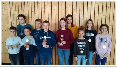 Das Gewehr aufgelegt und für die unter 12-jährigen mit dem Lichtgewehr nahmen 12 Mädchen und Jungen am Schülerpokal teil. Es siegte Johanna Voll mit einem 10,1-Teiler vor ihrem Bruder Leopold (33,3) und Luca Kraus (94,3). Alle durften sich über Pokale und Medaillen für ihre Leistungen freuen.