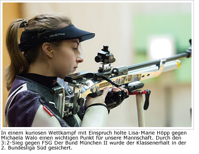 Einfacher wurde die Begegnung am Nachmittag gegen den ersatzgeschwächten Gastgeber. Außer auf Position eins, wo Melanie Werner mit einer starken Leistung ihren Gegner Manuel Schmitt mit 391:388 Ringen bezwang, war der Vorsprung in den restlichen Paarungen zu deutlich. Mit einer geschlossenen Mannschaftsleistung und sehr guten 1920 Ringen sprang ein ungefährdeter 5:0 Sieg heraus.