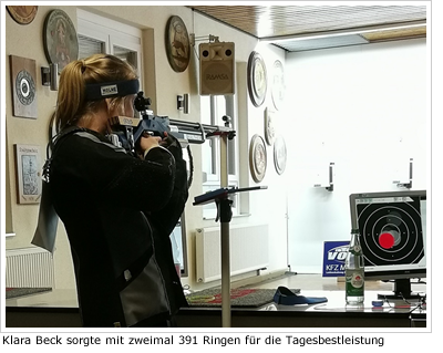 Als klarer Favorit ging unsere Mannschaft dann am Nachmittag gegen den Gastgeber an die Schießstände. Und sie wurde ihrer Favoritenrolle gerecht. Mit 5:0 und 68 mehr erzielten Ringen besiegten sie die SG`ler deutlich. Klara bestätigte mit 391 Ringen wiederrum ihre gute Form und war somit die herausragende Schützin an diesem Wettkampftag.